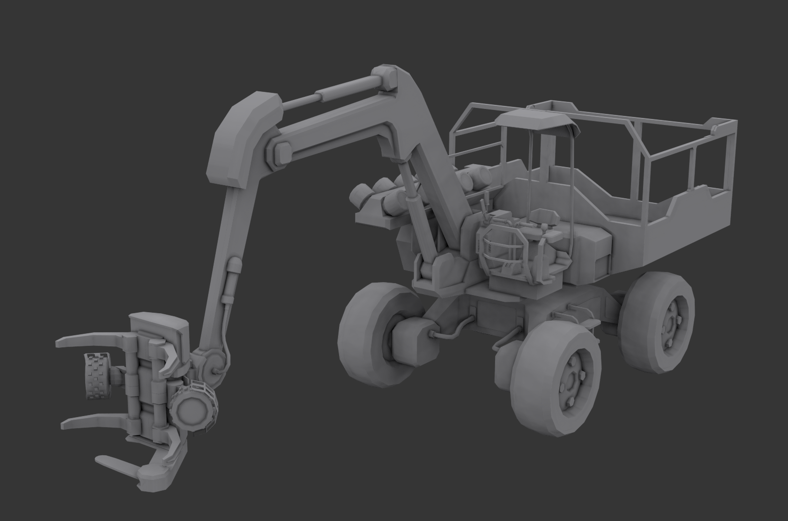 This is the model of our upcoming log harvester that will allow you to chop, cut and store trees away all in one go. Together with this vehicle we will implement some changes to the acquisition of resources, most notably an increase to resource density by changing trees to provide a larger amount of wood - but also being harder to fell. This will make the harvester especially efficient in its job, without increasing the difficulty for logging in the early game.